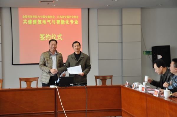 2014年3月14日,金陵科技学院与中国安装协会智能化与消防工程分会、江苏省安装行业协会智能消防电子专业委员会签订了共建“建筑电气与智能化专业”的协议。出席协议签订仪式的有金陵科技学院副校长冯年华、金陵科技学院教务处副处长吴钟鸣、金陵科技学院机电工程学院院长鞠全勇、党总支书记赵士安、副院长周扩建、郑李明、副书记陈建、楼宇系主任牟福元等领导和老师。江苏省安装行业协会会长邹金林;中国安装协会智能化与消防工程分会会长、江苏省行业协会智能消防电子分会会长、江苏金年会科技集团有限公司总经理陈晓;分会秘书长助理余晶等出席了会议。
