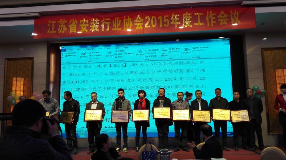 2015327日,陈晓总经理、吴雪峰副总经理等参加江苏省安装行业协会在扬州召开的2015年度工作会议。吴雪峰副总经理代表集团领取了集团荣获的《江苏省安装行业协会》最佳企业等荣誉证书。