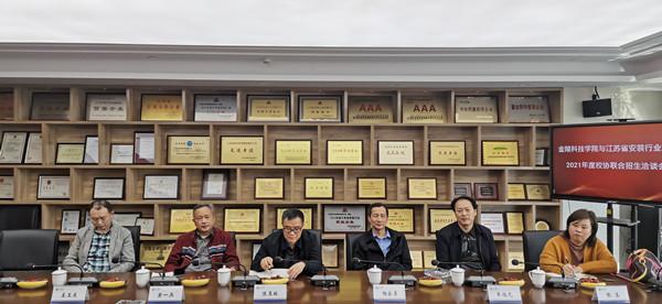 2021年4月20日,金陵科技学院与江苏省安装行业协会联合招生座谈会在江苏金年会科技集团有限公司召开。参加座谈会的有金陵科技学院继续教育学院院长陈玉林、学历教育科主任黄一兵,金陵科技学院机电学院院长鞠全勇、楼宇系主任牟福元、办公室主任张玉、项目负责人姜玉东,江苏省安装行业协会会长助理顾建生、副会长陈晓、秘书长吴辉、副秘书长席天阳,江苏省安装行业协会智能化与消防工程分会副秘书长余晶、办公室主任陈怡帆等。