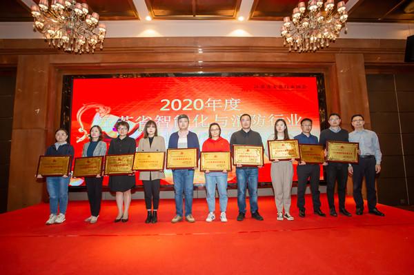 邹金林驻会副会长作了重要讲话,邹金林、吴辉向荣获2020年度江苏省智能化与消防工程科技创新企业颁发了证书、奖牌。