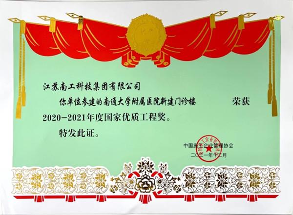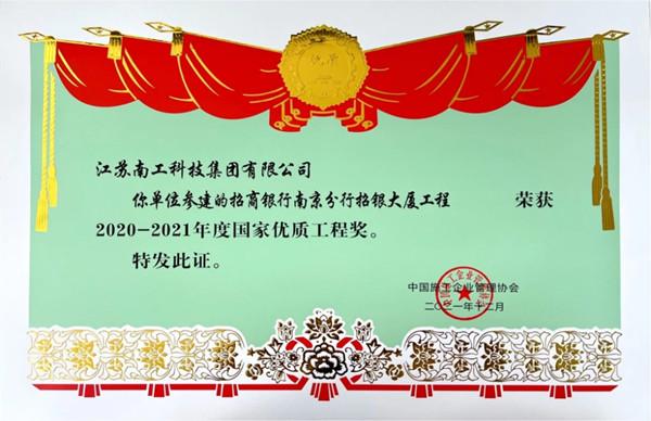 国家发展和改革委员会所属的中国施工企业管理协会,于近日正式颁发了2020-2021年度国家优质工程奖获奖证书,集团承建的“招商银行南京分行招银大厦消防工程”和“南通大学附属医院新建门诊楼智能化工程”两个项目同时荣获 “国家优质工程奖”。