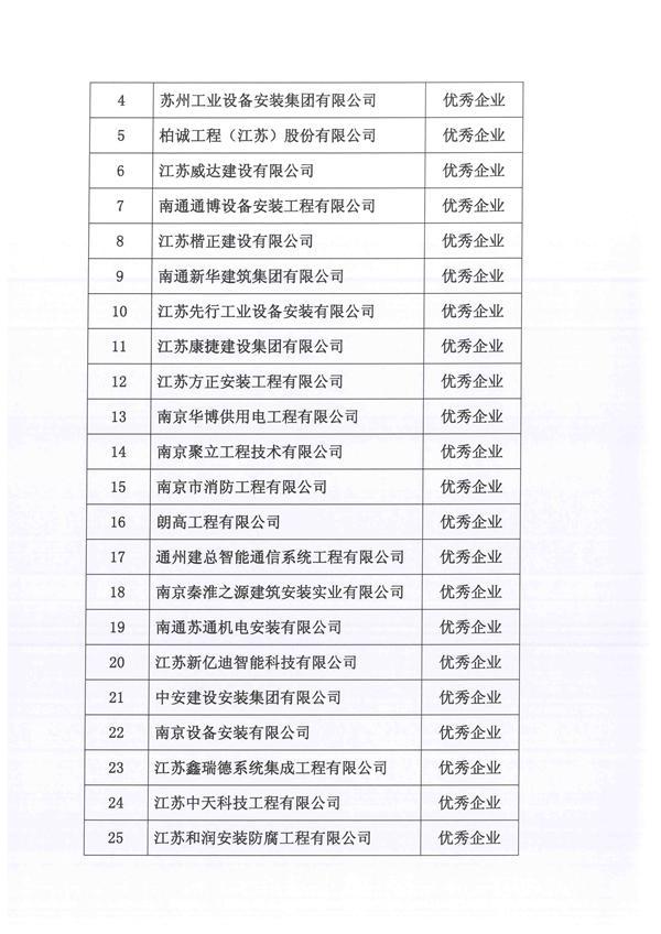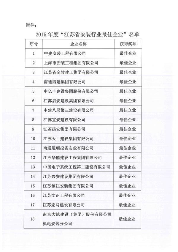 关于表彰2015年度江苏省安装行业最佳企业(优秀企业)的决定
